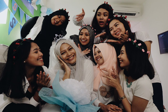 Sebelum menikah, sahabat saya di kantor juga menyelenggarakan pesta lajang ((pesta lajang)) alias bridal shower (bener gak sih?) untuk saya. Mereka pinter banget nyembunyiin rahasianya!