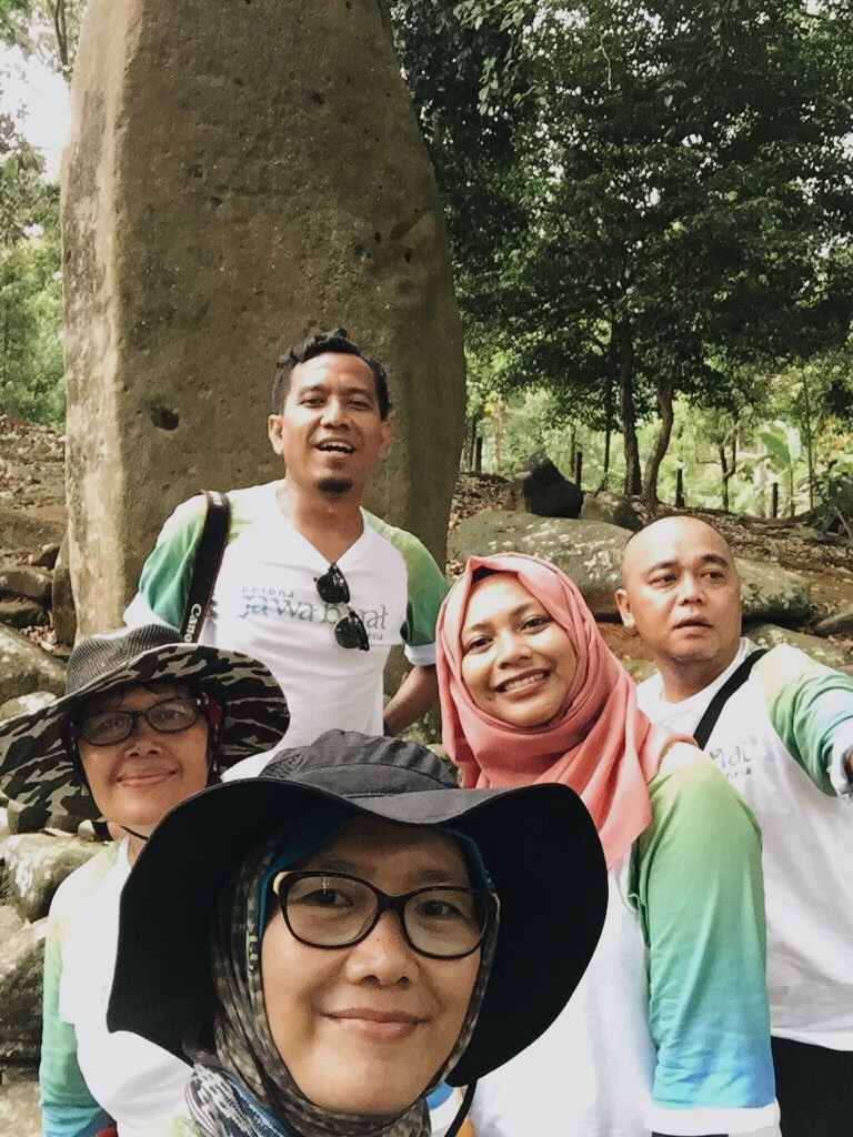 Setelah cukup mabok durian, kami melanjutkan perjalanan ke Tugu Cengkuk, situs peninggalan sejarah zaman Megalitik. 30 menit perjalanan, mobil kami berhenti. Saya kira sudah sampai, eh ternyata kami harus ganti mobil karena bus travel yang kami naiki tidak kuat menanjak di jalanan bebatuan!