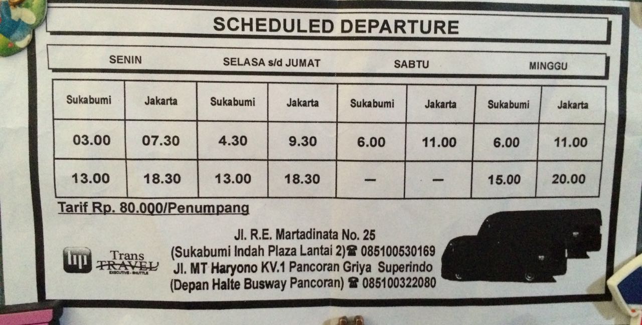 Masing-masing rute travel Jakarta – Sukabumi dan sebaliknya hanya jalan satu kali sehari. Lebih baik memesan jauh-jauh hari sebelumnya karena mobil operasionalnya hanya ada satu di tiap jam keberangkatan. Mobilnya nyaman, full ac, dan jarak lutut ke bangku depan lumayan luas. Waktu tempuh perjalanan 3-4 jam. Very reccomended! Oh ya, pool Trans Travel yang di Sukabumi terletak di Sukabumi Indah Plaza (Ex Giant) lantai 2.